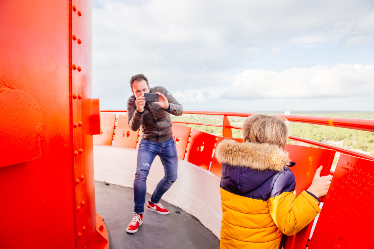 Après le déjeuner, en route pour notre rituel de Noël, grimper les 258 marches en famille pour atteindre le sommet. Nous avions entendu parler d’immenses travaux de rénovation du Phare. Nous étions impatients de le redécouvrir. La surprise fut belle, des couleurs éclatantes, un garde corps et une table de lecture lumineuse et sacrément originale.
