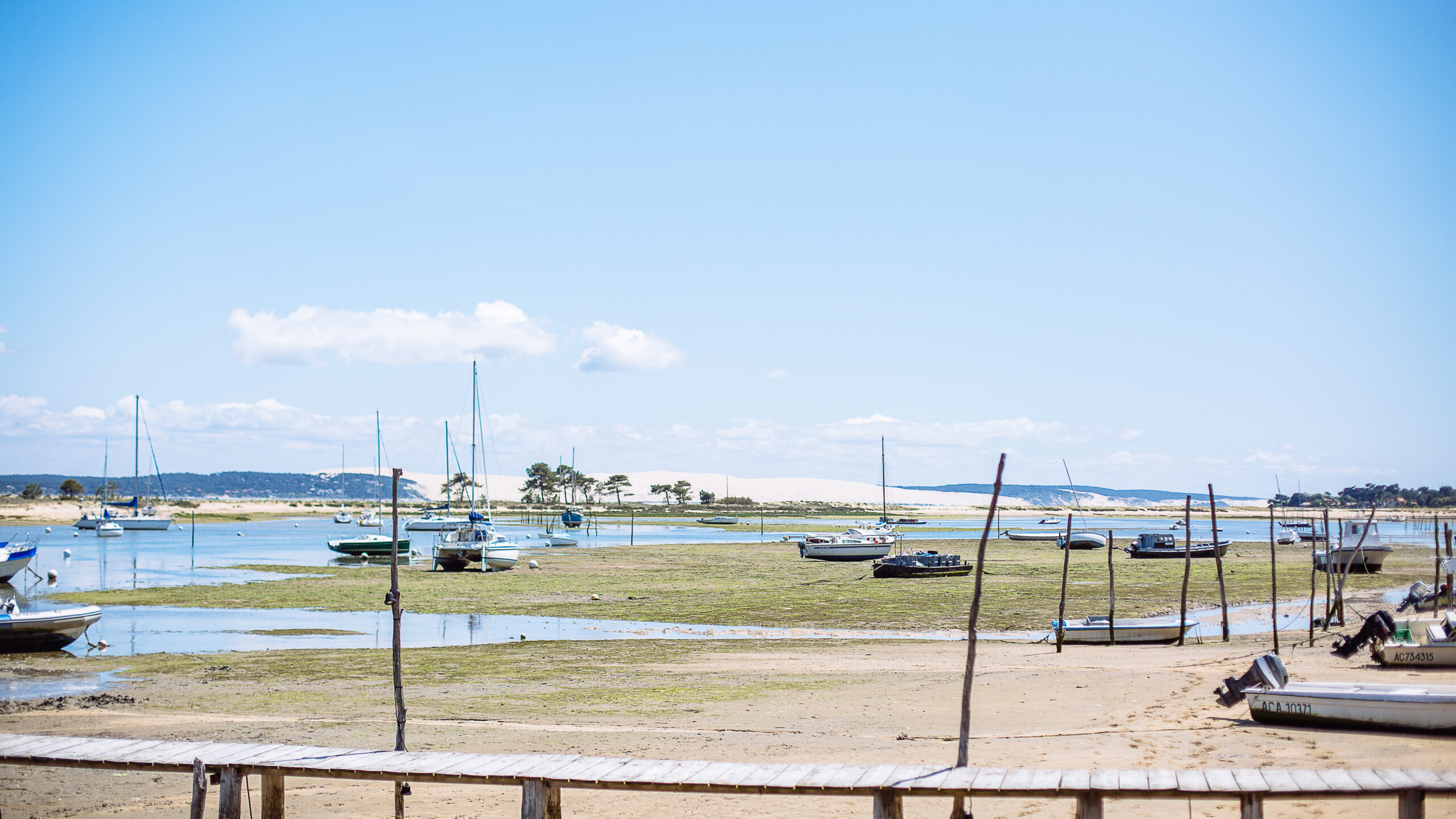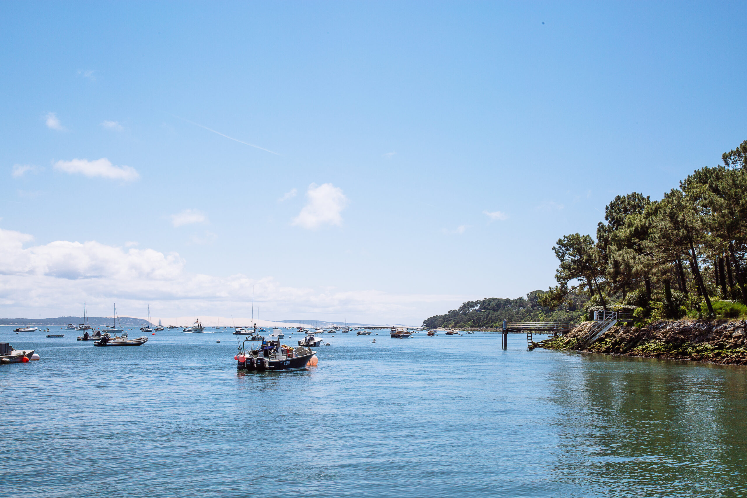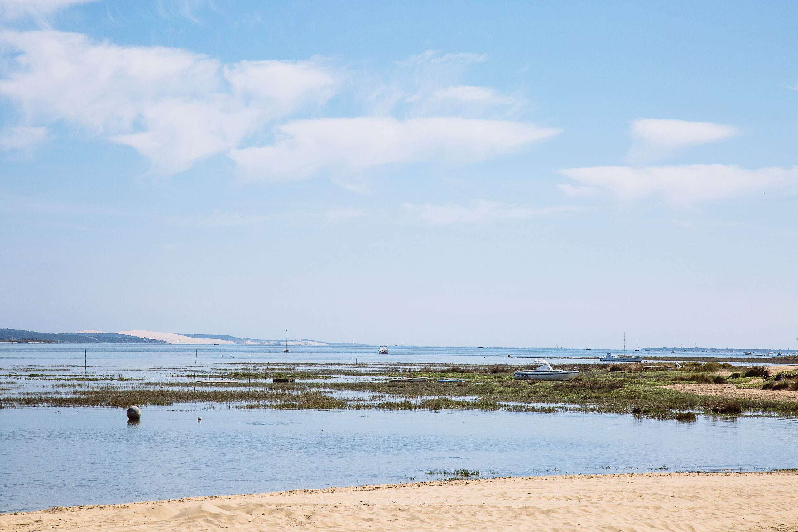 Pour nous, c’est l’endroit le plus poétique pour prendre en photo la Dune du Pilat. Avec les bateaux amarrés, les piques plantés dans l’eau et les jolis pontons de bois, le paysage prend une tout autre tonalité.