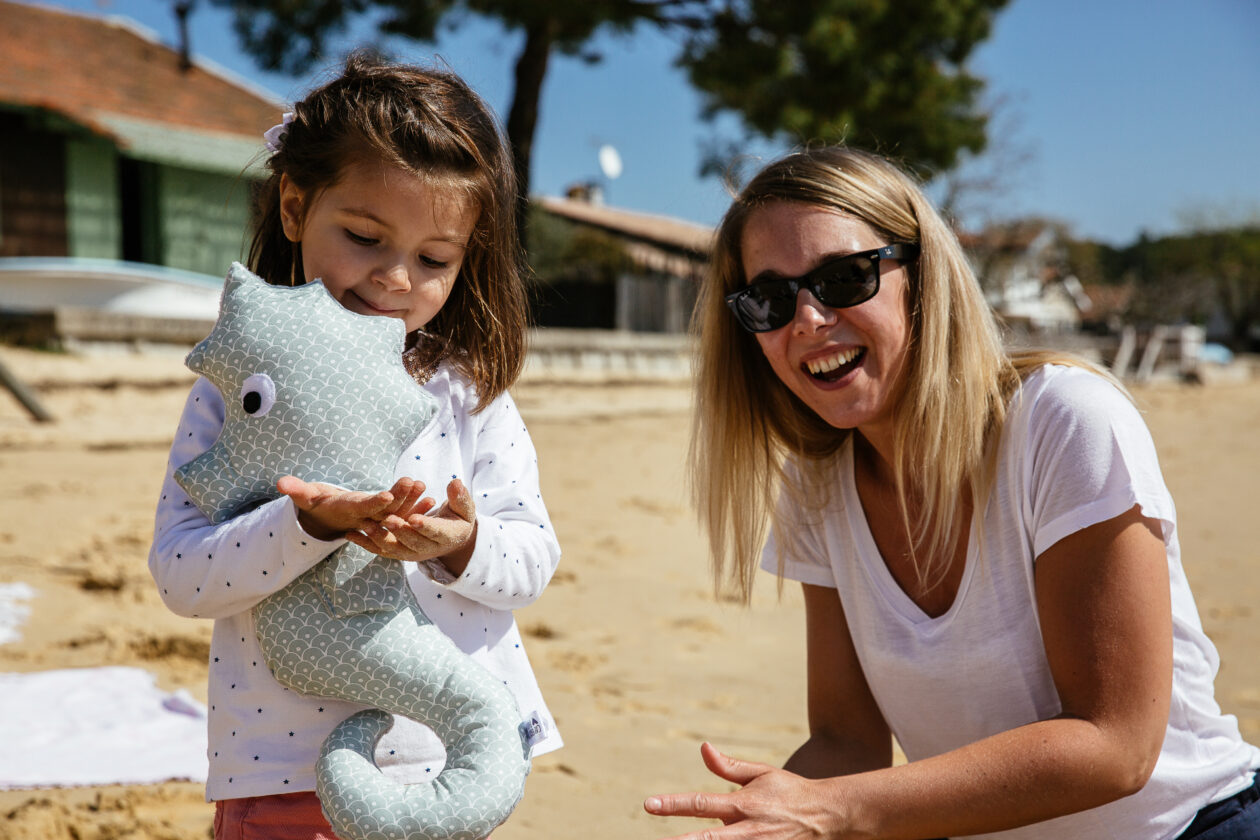 Nous arrivons devant la maison avec une vue magnifique sur la plage de Petit Piquey. Camille devait nous attendre de pied ferme car c’est le gros calin assuré dès notre arrivée ! Retrouvailles oblige, on déballe les quelques emplettes trouvées pour les enfants à la boutique Mazette du Cap Ferret ! Doudou et body pour Jules, vareuse et fichu pour Camille, les enfants ont déjà adopté leurs cadeaux…