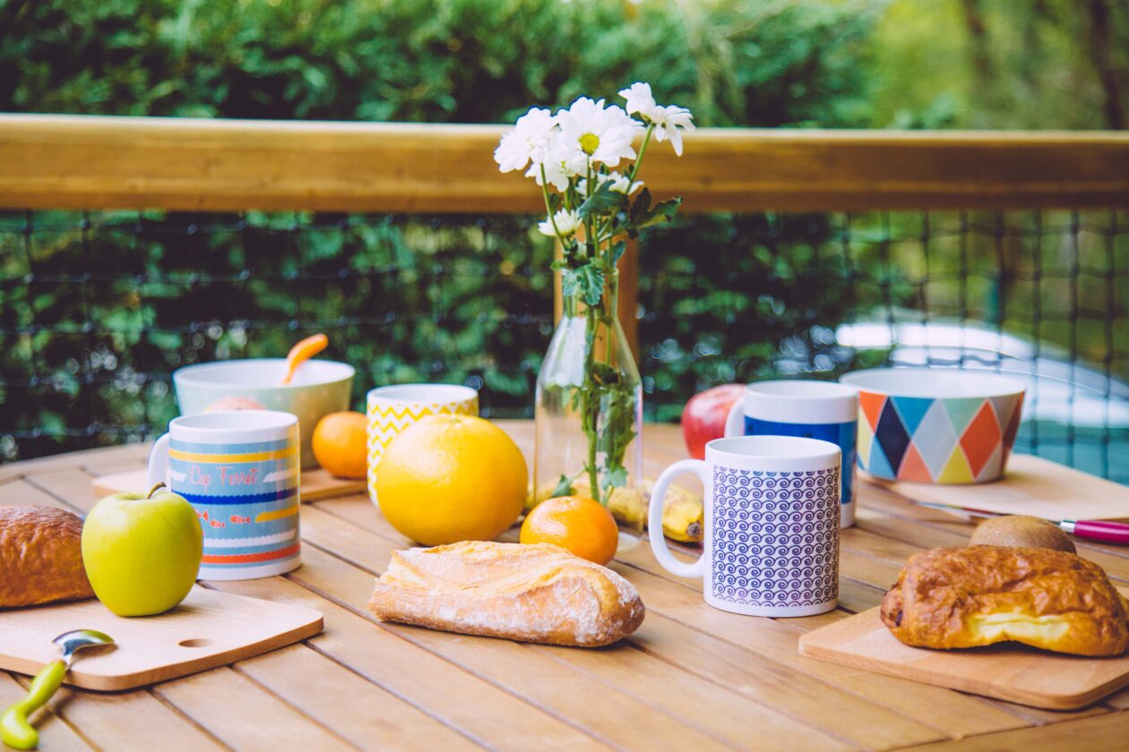 Ici la terrasse s’apprécie encore plus au moment du petit-déjeuner, avec une table remplie de fruits et gourmandises sucrées !