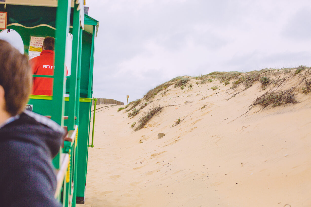 La ligne du petit train trace la voie entre 2 mers, le Bassin d’un côté et l’océan de l’autre, en passant dans les rues du Cap Ferret et jouant du klaxon pour prévenir les passants de son passage.